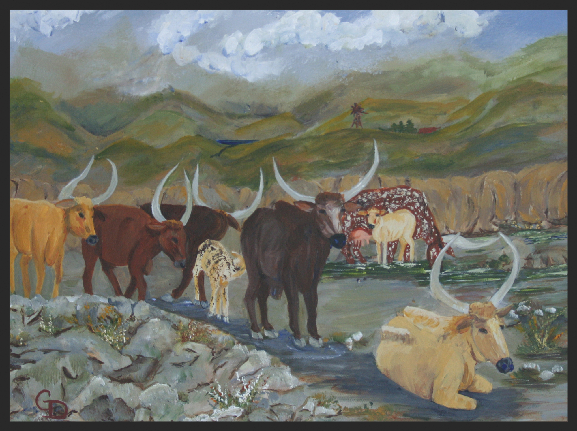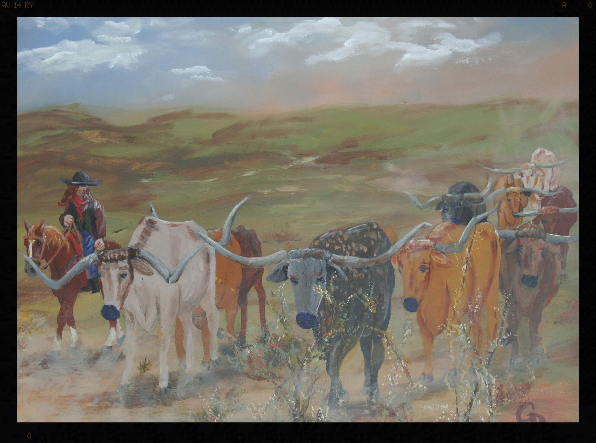 I’ve always loved the western genre and when I decided that my 2016 entries in the Old West Art show would be about trail herds, I started researching. After the Civil War, untended herds in Texas multiplied quickly as Union blockades cut the state off from market outlets. four-dollar-per-head cattle in Texas could bring $40 to $50 apiece in eastern markets In 1866 Charles Goodnight and Oliver Loving blazed the first trail, known as the Goodnight-Loving trail northwest from Palo Pinto County, Texas, to Pope's Crossing in southeastern New Mexico, and on north to Fort Sumner and Fort Bascom. In 1867 the 600-mile Chisholm Trail (sometimes referred to as Chisium) initially developed by merchant Jesse Chisholm became the main trail, and it was used extensively until 1871. It ran north from San Antonio to Fort Worth, Texas, through Oklahoma and ended at Abilene, Kansas. stock pens built in Abilene to hold cattle for shipment on the Kansas Pacific Railroad waited for the herds. In 1871 alone, Cowboys drove some 600,000-700,000 Texas Longhorns north from Texas. In 1884, the great era of the cattle trails ended when Kansas enacted a quarantine against Texas cattle due to the spread of “Texas Fever” (a tick borne cattle disease to which the longhorns were immune) effectively killing the large northern drives. The final blow to the cattle drives came when the railroads pushed trunk lines south so that cattle could be shipped directly from Texas. Sporadic drives continued on a lower basis for another decade, but the great era of the cattle trails had ended.